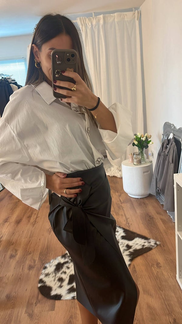 Gonna nera similpelle con chiusura portafoglio e fiocco laterale . Disponibile anche in bordeaux