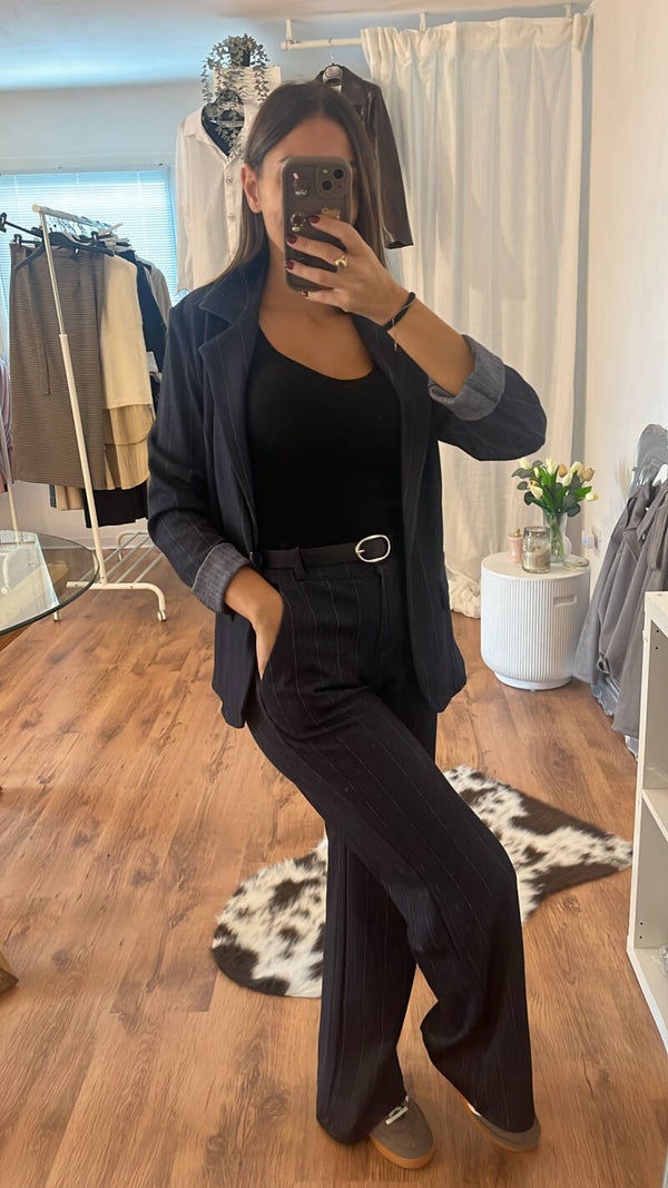 Completo gessato blu notte con cintura. Giacca sagomata e pantalone morbido a palazzo