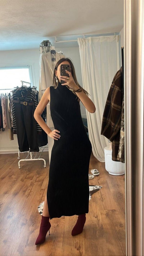 Maxi vestito a costine, l'essenziale per un look comodo, elegante e sofisticato. Il tessuto segue la silhouette ed è ideale con sneakers o stivali. Perfetto come abito lungo basic da giorno.